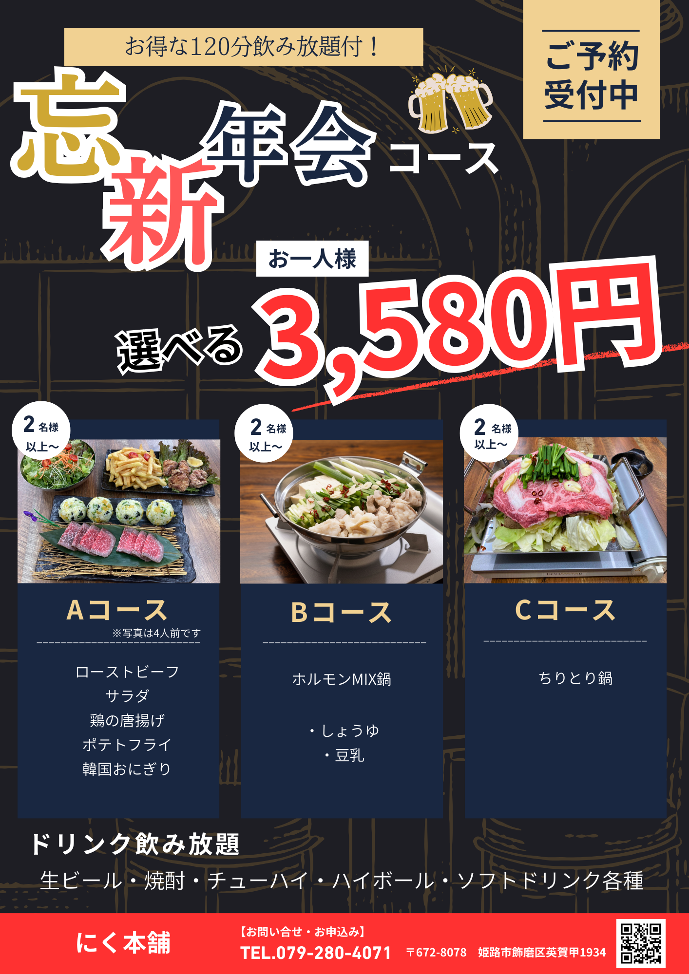 通常の宴会コースに加え、3580円(飲み放題込み)プランをご用意しました。