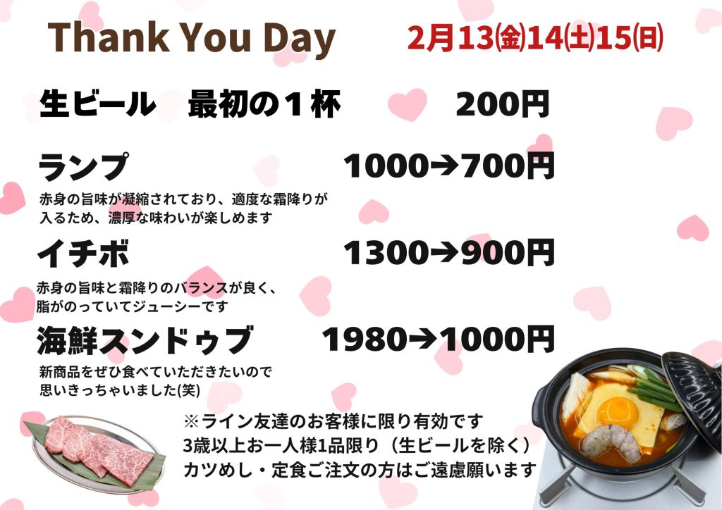2月13㈮14㈯15㈰ ThankYouDay 2026 2/12 February 12, 2026 こんにちは!2026年2月13㈮14㈯15㈰限定のクーポンを配信します。上質なお肉をお得に味わえるチャンスとなりますので、ぜひご活用ください。 クーポン よかったらシェアしてね! URLをコピーしました! URLをコピーしました! 2月6㈮7㈯8㈰大寒謝祭 2月27㈮28㈯3月1㈰にくの日 関連記事 4月17㈮18㈯19㈰ ThankYouDay April 14, 2026 4月14㈫15㈬営業時間についてお知らせ April 9, 2026 3月27㈮28㈯29㈰にくの日 March 25, 2026 3月13㈮14㈯15㈰にく本舗からのWhiteDay March 9, 2026 2月27㈮28㈯3月1㈰にくの日 February 24, 2026 2月6㈮7㈯8㈰大寒謝祭 February 6, 2026 1月29㈭30㈮31㈯にくの日 January 27, 2026 2026年1月16㈮17㈯18㈰ThankYouDAY January 13, 2026